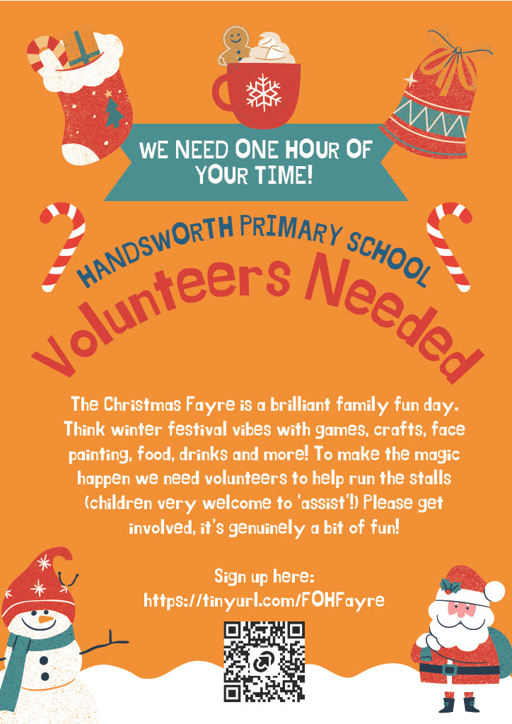 Volunteers: If you can spare just one hour on the day, we would truly appreciate your help. You are welcome to bring your children along, and volunteering is always a great way to be part of the school community. You can sign up here: https://tinyurl.com/FOHFayre