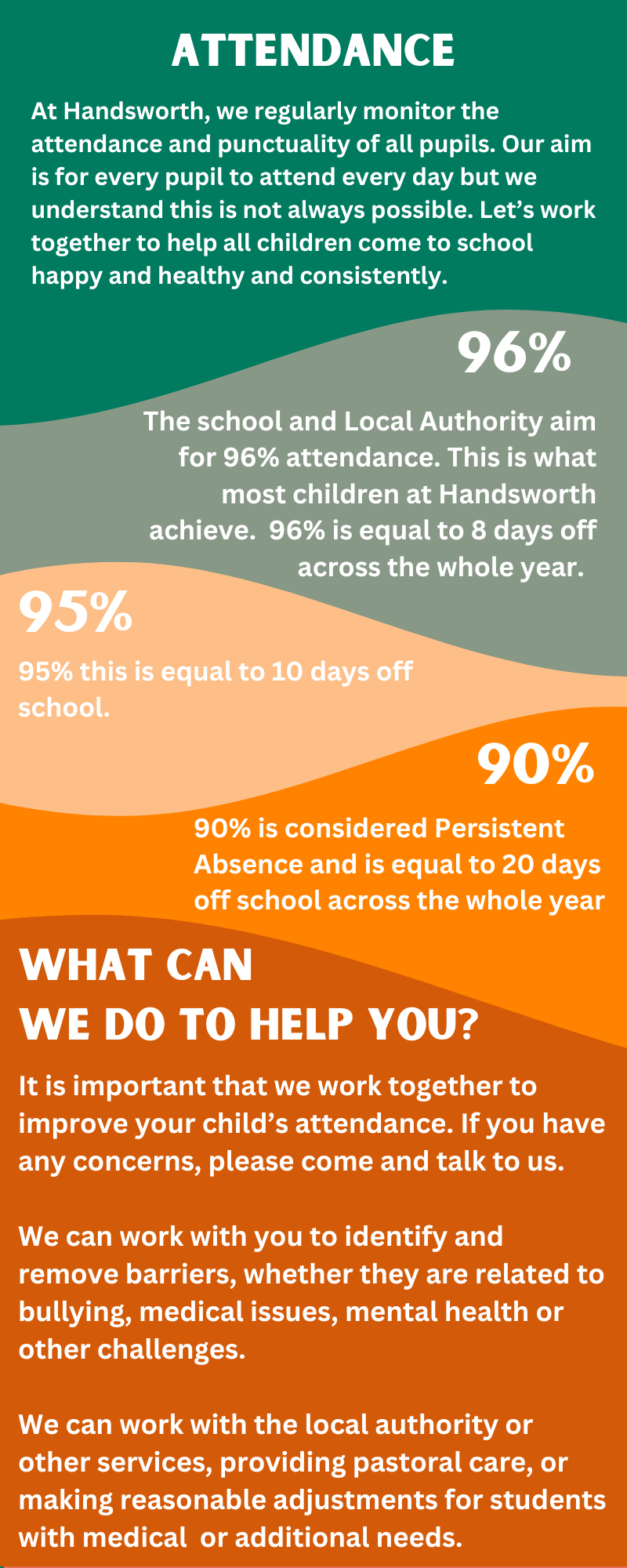 At Handsworth, we regularly monitor the attendance and punctuality of all pupils. The Dfe states that 96% attendance is good attendance, below 90% is persistent absence which can lead to a fine.