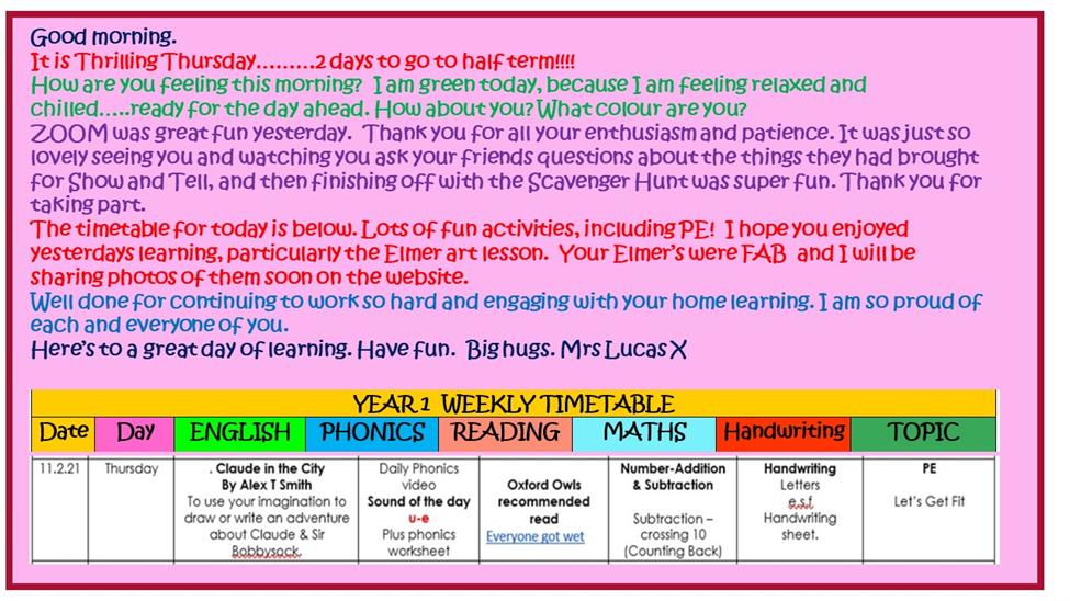 Good morning Mrs Lucas and everyone in the class . I am happy this morning eating a mango yoghurt you should try it. I liked making Elmer yesterday .