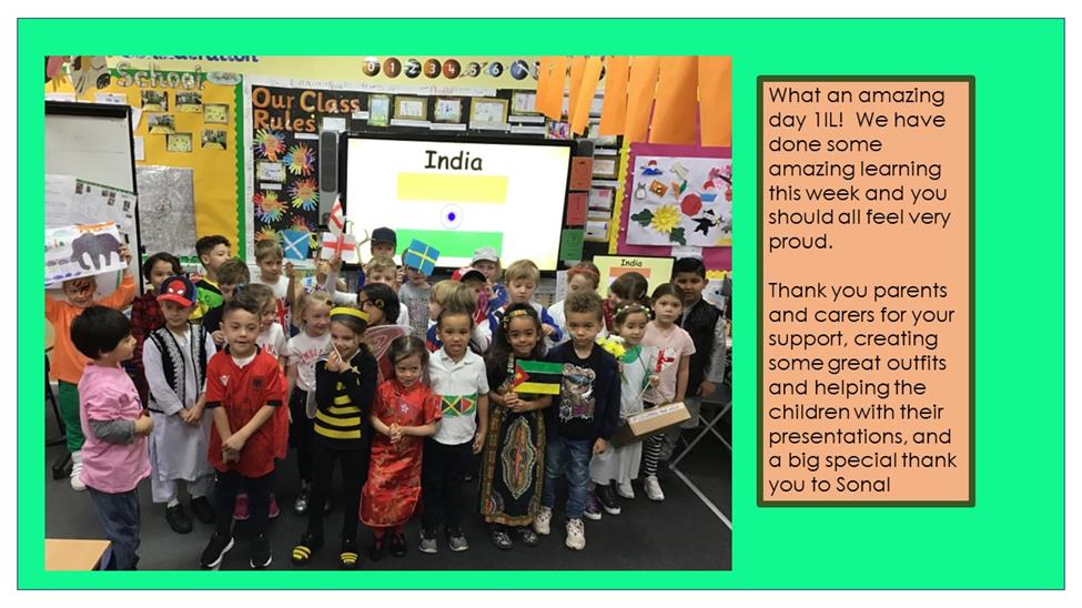 Rosie really enjoyed international day, she came home full of facts about India and the heritage of the different pupils in the class. Thank you for all the hard work that went into it.