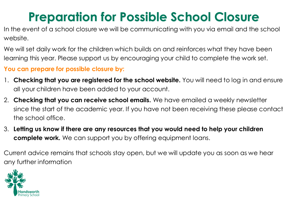 Following tonight’s announcement by the Education Secretary, Gavin Williamson, we advise you that school will close on Friday, 20 March, at the usual time. The UK government has stated that schools will remain closed until further notice. Children who normally attend Breakfast Club and/or After School Club are able to do so until Friday.